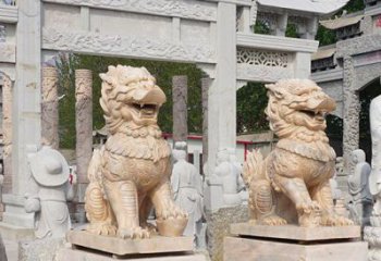 漢白玉石雕景區(qū)戶外麒麟雕塑一般都被雕成右前爪玩弄繡球或者兩前爪之間方一個繡球張嘴的造型,代表權(quán)力和統(tǒng)一。美化景區(qū)麒麟雕塑也有著不同的含義。古老的美化景區(qū)戶外麒麟雕塑兩側(cè)的石獅左公右母,公獅張口注視來往信眾。傳承漢白玉美化戶外麒麟雕塑閉口護(hù)子,表現(xiàn)傳統(tǒng)社會男尊女卑、各司其職的特性。